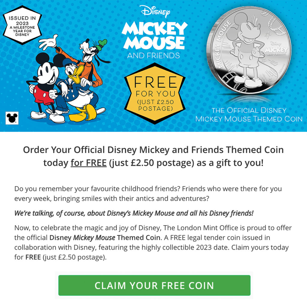 Order your Official Disney Mickey and Friends Themed Coin today for FREE